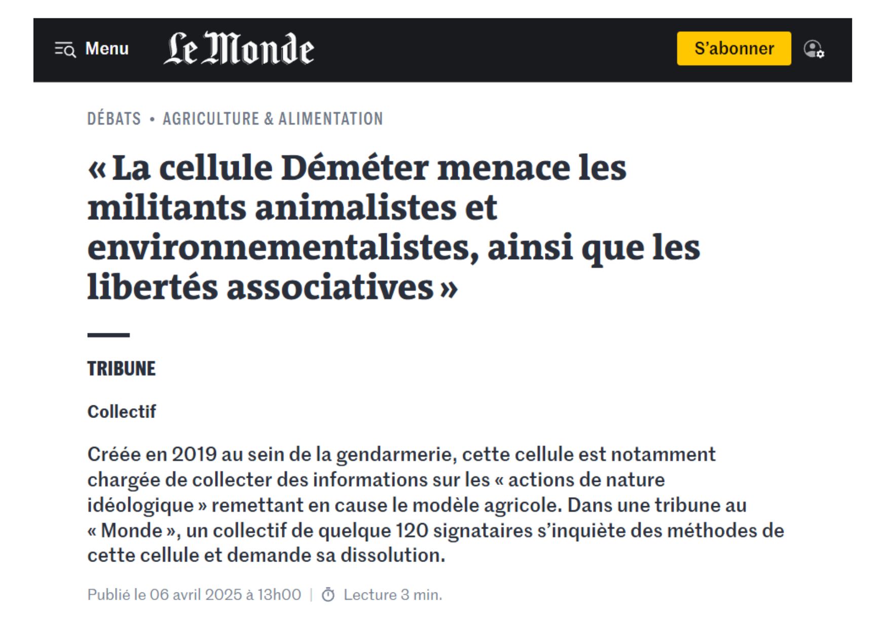 Tribune : "Jamais nous n'avons enfermé et tué autant d'animaux..."